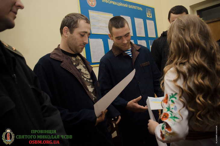 Ігумен монастиря Отців Василіян − о. Веніамин Довганич уділив благословення нашим Захисникам та окропив свяченою водою, а дітки разом зі с. Домінікою Данканич ЧСВВ, подарували Героям власноручно виконані малюнки, вервички та солодкі тістечка, приготовані батьками.