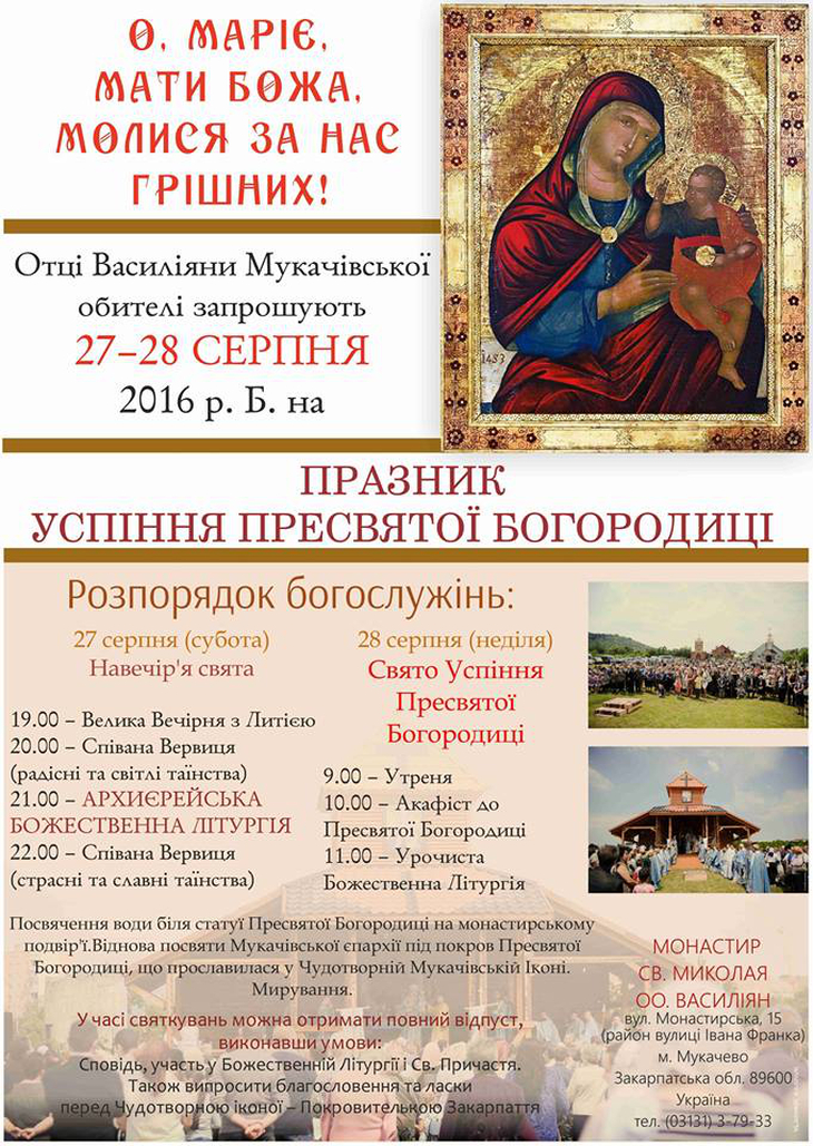 Отці Василіяни Мукачівської обителі запрошують 27-28 серпня 2016 р. Б., на Празник Успіння Пресвятої Богородиці.