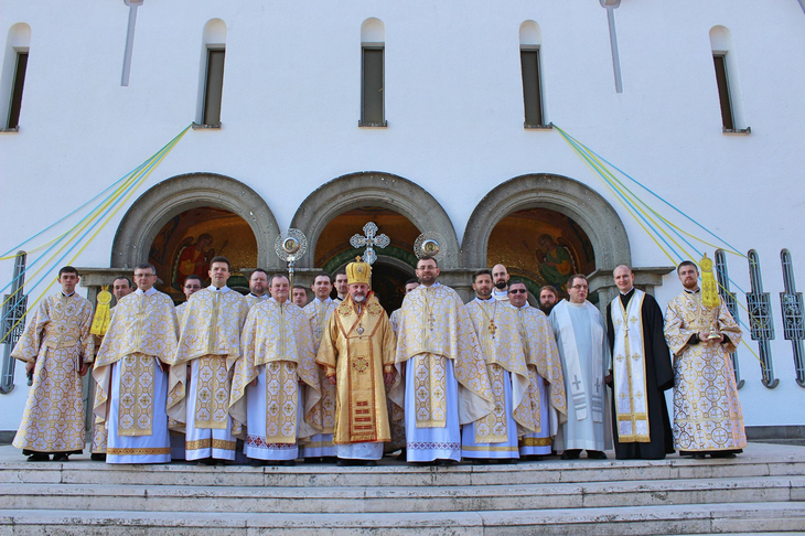 О 10 год. розпочалася Архиєрейська Божественна Літургія, яку очолив владика Ігор. З ним співслужили о. Марко Ярослав Семеген, голова Товариства «Свята Софія» і ректор собору, о. Ґенезій Віомар, ЧСВВ, Протоархимандрит, о. Ярослав Карп’як, працівник Конґреґації для Східних Церков, о. Теодосій Грень, ЧСВВ, Віце-ректор Папської Української Колегії Святого Йосафата, о. Діонисій Заведюк, ЧСВВ, о. Атанасій Мак-Вей, дон П’єрпаоло Феліколо, представник Римського вікаріату й організації «Міґрантес», дон Матео Ґардзінски, отці Йосафат Коваль, ЧСВВ, Іван Гобела, Любомир Филипчак, Роман Скрипнюк, Юліан Скасків, диякони Микола Щербак і Роман Бабій. Обов’язки церемонієра виконував о. Андрій Солецький.