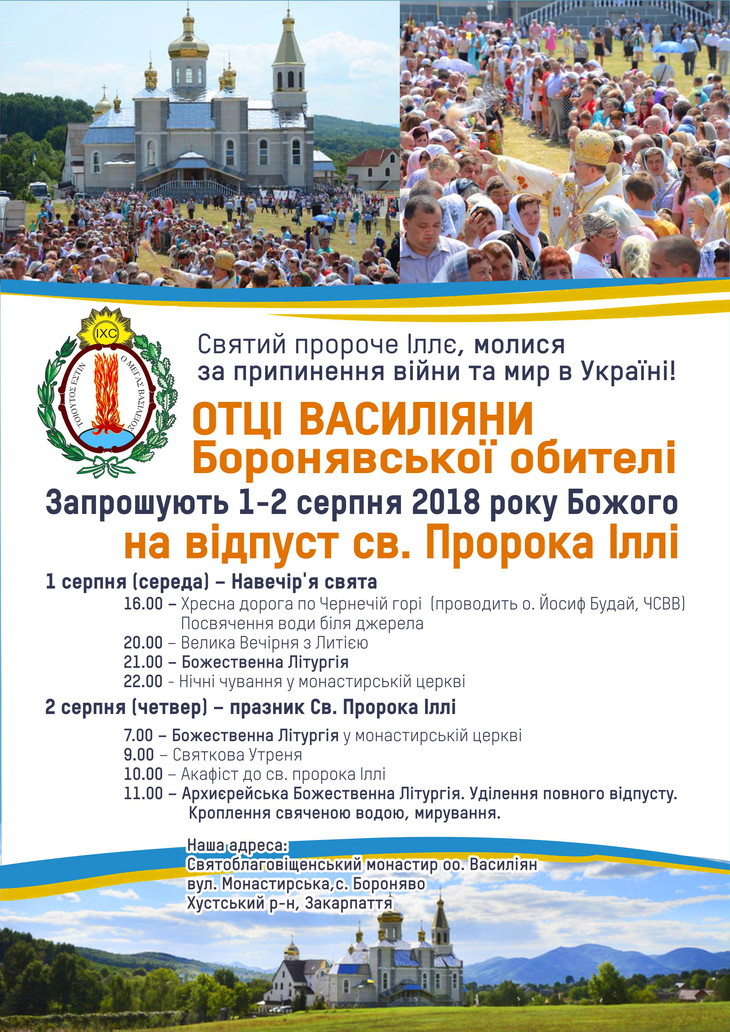 1-2 серпня 2018 р., в Боронявському монастирі відбудуться відпустові святкування празника Св. Пророка Іллі.
