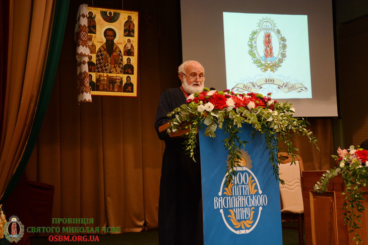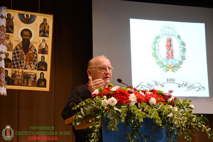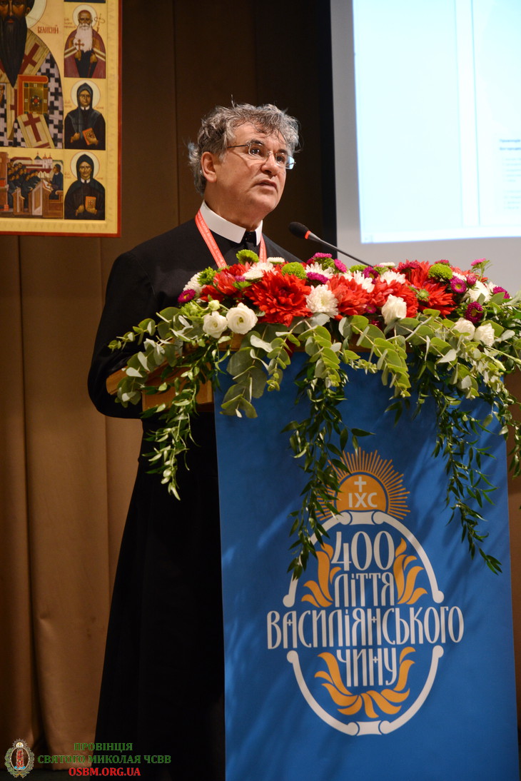 Зі словами вітання до присутніх звернувся Протоархимандрит (генеральний настоятель) Василіянського Чину св. Йосафата о. Генезій Віомар, ЧСВВ. Говорячи про реформу монашества митрополитом Йосифом Велямином Рутським, він наголосив на його бажання оновити запал чернечого духу Київської митрополії. Розповідаючи про головні етапи Чину о. Генезій вказав на момент, коли у складних умовах перед ченцями стояло питання «бути чи не бути». Але василіяни вистояли завдяки підтримці Апостольської Столиці та капітул, що були наче соборчиками Унійної Церкви. І вже у ХVІІІ ст. нараховувалося 200 монастирів і близько 1000 ченців аж до першого поділу Польщі. За 400 років до Василіянського Чину упродовж історії належало близько 8000 ченців.