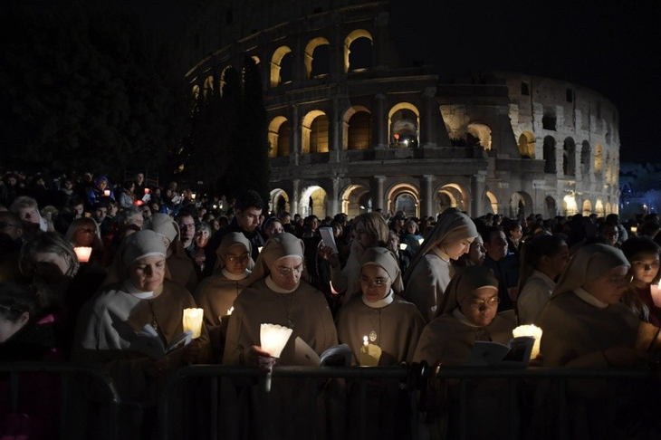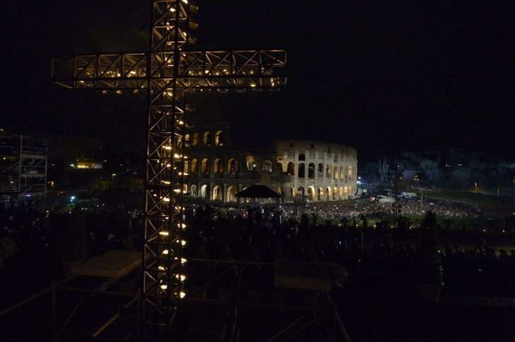 Десятки тисяч римлян і паломників з усього світу із свічками та смолоскипами в руках збираються навколо цього, найвідомішого у всьому світі амфітеатру, пам’ятки давньоримських часів, щоб разом із Вселенським Архиєреєм пройти хресним шляхом Ісуса.