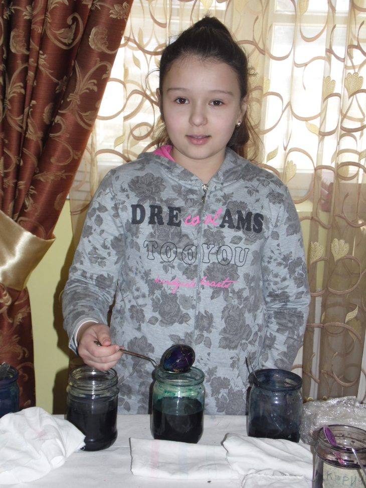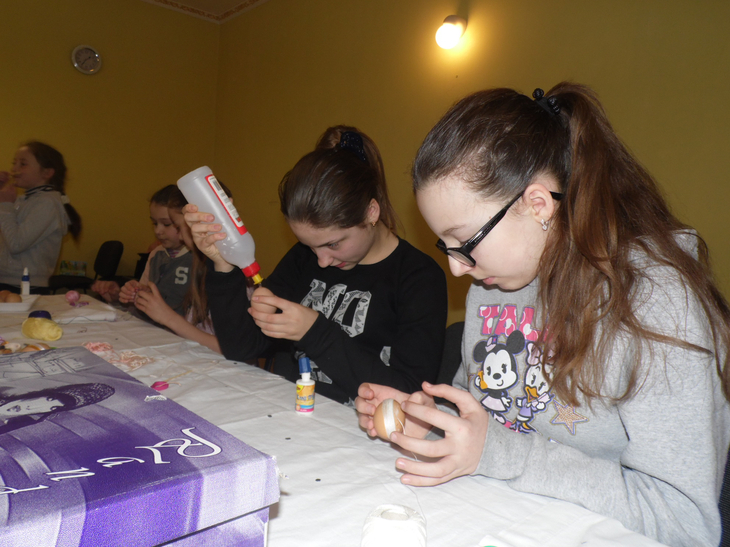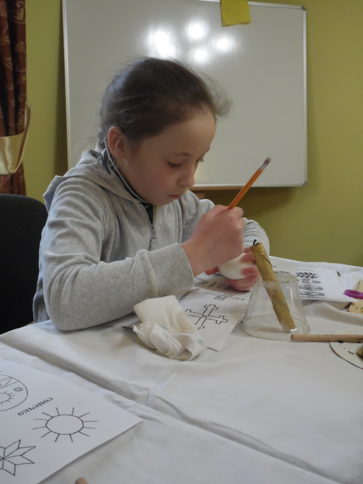Кожен маленький майстер мав своє особисте робоче місце і все, що потрібно для роботи: яйце, віск, писачок, свічку, фарби, зразки розмальованих писанок, нитки, клей. Діти вперше спробували себе у цій справі, дуже хвилювались та боялися, що в них нічого не вийде. Але писанка вийшла у кожного! Основне правило від майстрині: «Негарних писанок не буває!» І всі учасники майстер-класу переконалися у цьому, коли на останньому етапі почали знімати віск, і під вогнем свічок розквітли різнокольорові орнаменти на їхніх писанках. Оригінальними вийшли писанки, мотані нитками. Ця технологія більше припала до душі дітям старшого віку. Також всім сподобалося вироблення підвісок із помпонами, на яких будуть висіти всі воскові писанки.