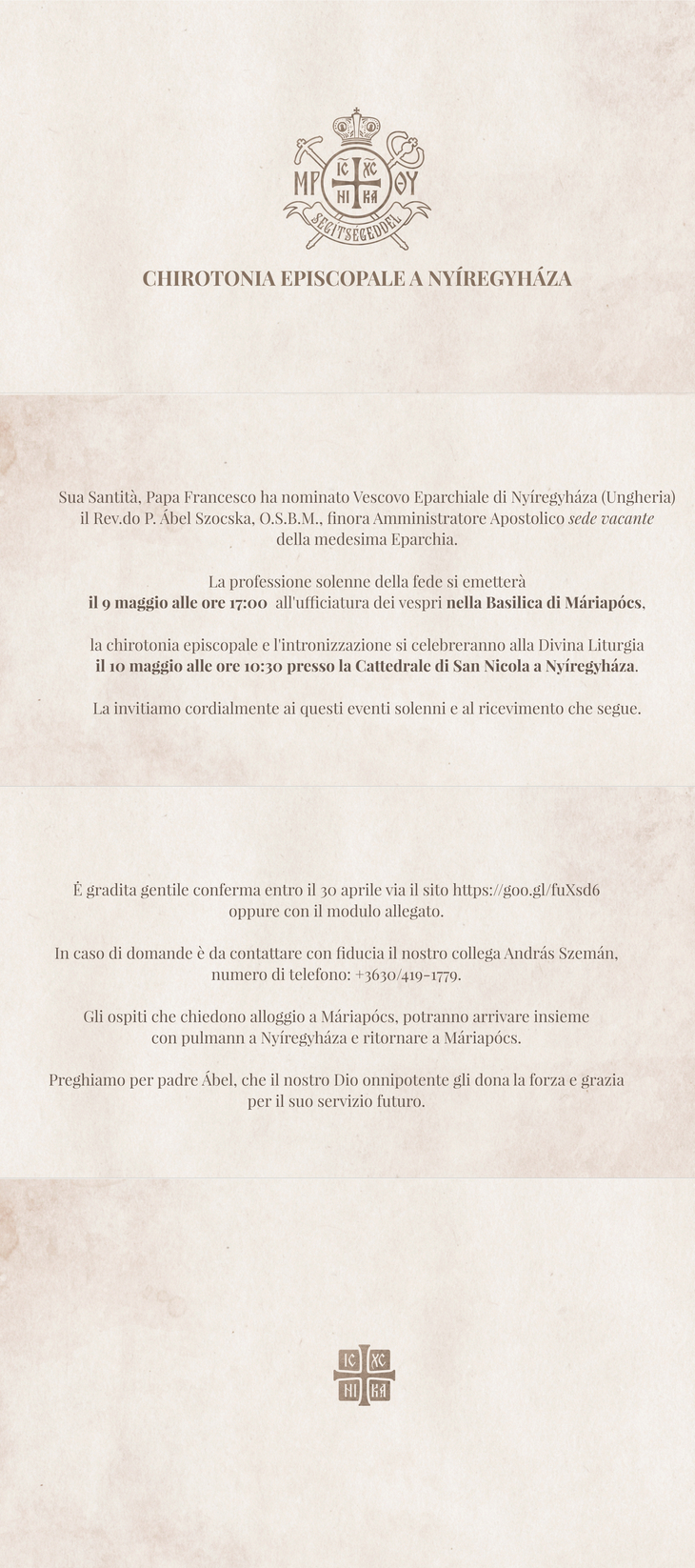 - 10 травня – четвер (10:30) – в Ньїредьгазі (Катедра Св. Миколая) відбудеться єпископська хіротонія та інтронізація Владики-номінанта Авеля, під час Архієрейської Божественної Літургії.