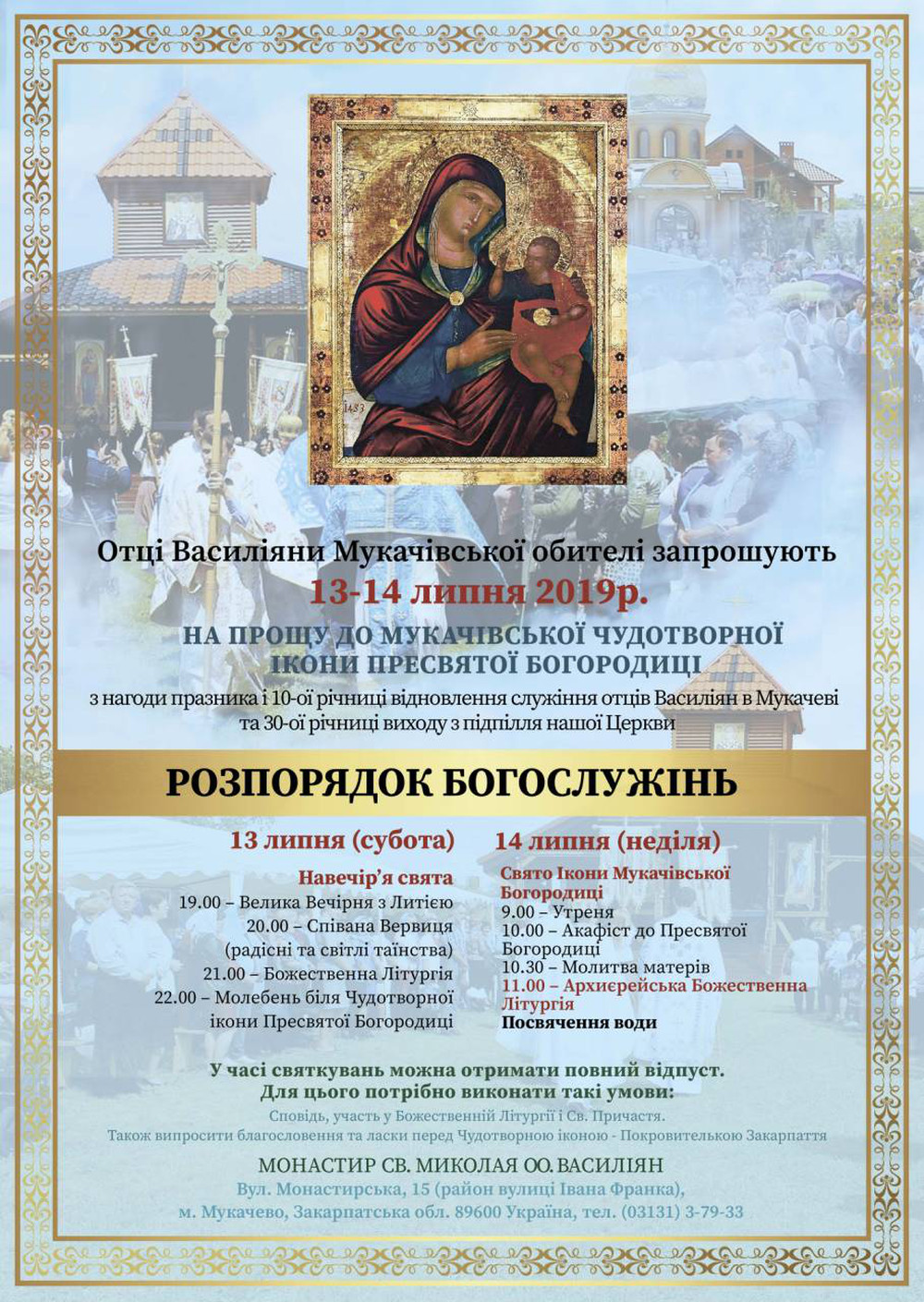 13-14 липня 2019 р. Б., в Мукачівському монастирі Отців Василіян відбудуться святкування з нагоди празника Чудотворної Ікони Пресвятої Богородиці, під час якого відзначатиметься 10-та річниця відновлення служіння Отців Василіян у м. Мукачеві та 30-та річниця виходу з підпілля нашої Церкви.