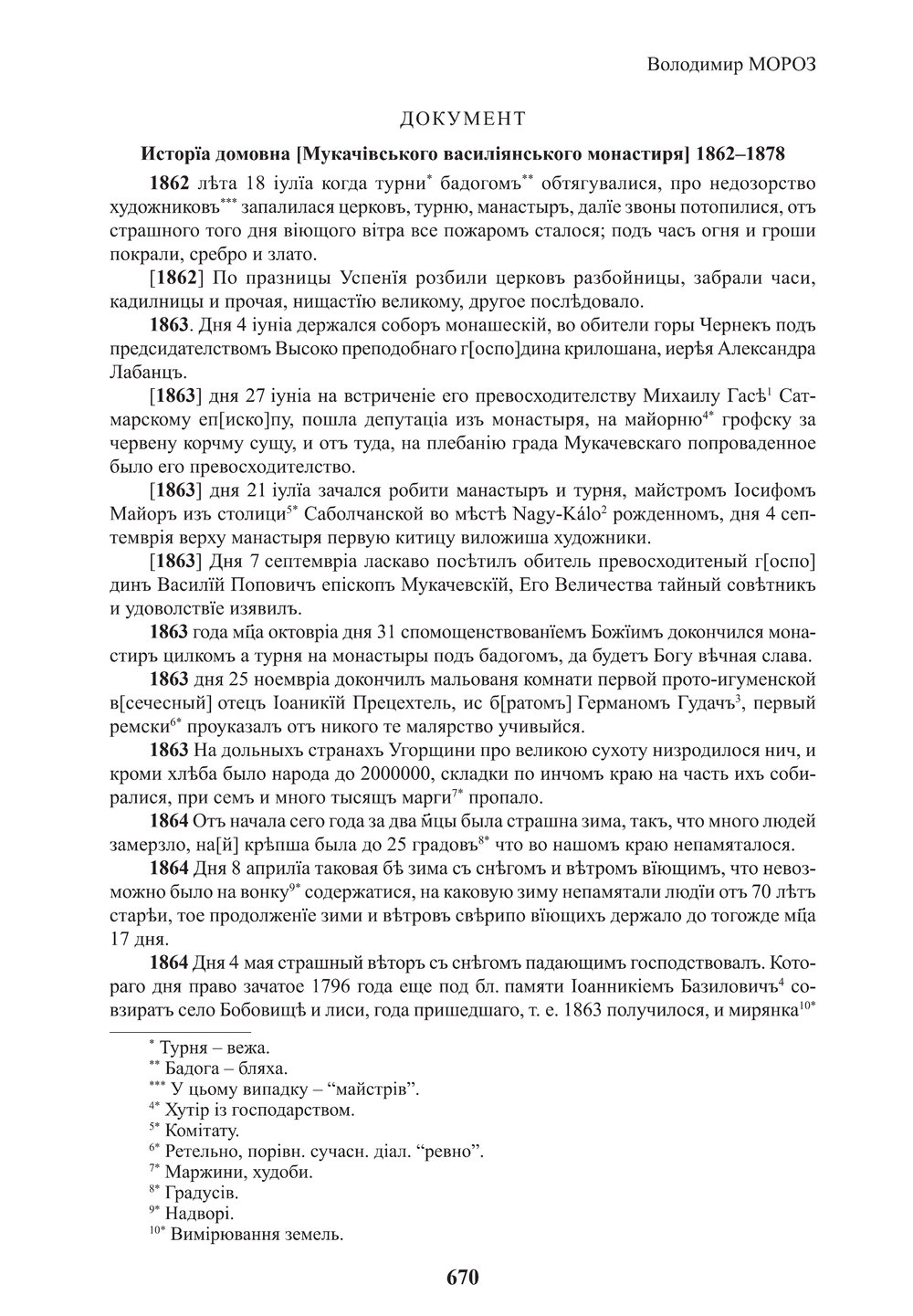 У фондах історичного архіву Мукачівського греко-католицького василіянського монастиря св. Миколая, конфіскованих до Державного архіву Закарпатської області після насильної ліквідації обителі в радянські часи, я натрапив на непублікований рукопис “Исторїа домовна” цієї чернечої обителі[1]. Документ є хронікою життя обителі на Чернечій горі за період 18 липня 1862 р. – 4 червня 1878 р. Він займає сім аркушів типового для другої половини ХІХ ст. канцелярського паперу, списаного з обох боків і пожовклого від часу. “Исторїа домовна” – унікальне джерело, що містить важливу інформацію щодо господарської історії Мукачівського монастиря, а також ментальної та інтелектуальної історії Василіянського Чину, ширше – Греко-Католицької Церкви і загалом руського, тобто українського (надалі у тексті вживатиму цей термін) народу на Закарпатті. Щоби окреслити середовище, творінням якого стала “Исторїа домовна”, слід хоча б узагальнено охарактеризувати історію і значущість Мукачівського монастиря.