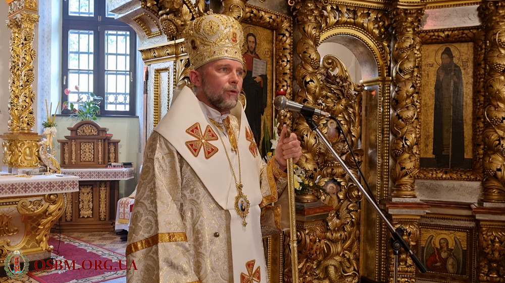 Головний служитель, владика Василій, в урочистій проповіді зазначив, яке велике значення має життя пустельників, які стали новітніми мучениками віри, відрікшись від усіх земних благ, щоб усім показати правдиву дорогу навернення, віри і повного покладання на Бога. У посвяття Зіслання Святого Духа ми згадуємо про апостолів, які під дією Святого Духа сміливо свідчили Христове воскресіння аж до мученицької смерті. Такими свідками у перші століття Церкви стали мученики, а після надання їй свободи святим Костянтином – ченці, особливо пустельники, які, живучи на землі, ніби померли і віддали все на свідчення Христового воскресіння. Святий Онуфрій не просто був сам, а вів непримиренну боротьбу проти зла і пристрастей. Наступниками цих пустельників і мучеників стали наші сучасники – мученики за віру ХХ століття. Господь тепер і нас покликав особливо тих, які цілковито посвятилися Богові у чернечому стані, щоб бути свідками Ісуса Христа у цьому світі.